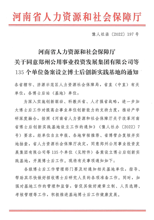 7月7日,河南省人力資源和社會保障廳下發《關于同意鄭州公用事業投資發展集團有限公司等135個單位備案設立博士后創新實踐基地的通知》(豫人社函〔2022〕197號),我公司成功獲批設立博士后創新實踐基地。